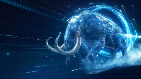 A glowing, translucent mammoth with digital elements charges forward in a dark, starry environment, surrounded by blue light trails.