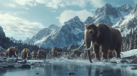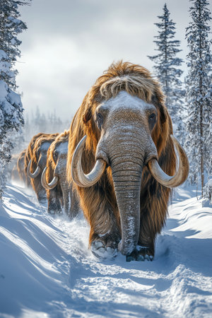 Woolly mammoths walking through icy terrain, daylight