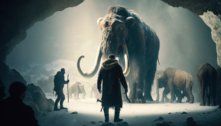 Fantasy scene of a cave with a big mammoth in the background. generative ai