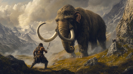 A prehistoric man with a spear stalks a woolly mammoth, with both figures set against a vast and rugged landscape