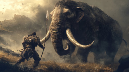 A primitive man in a fur outfit, spear raised, faces a giant mammoth in a dramatic chase through a prehistoric scene
