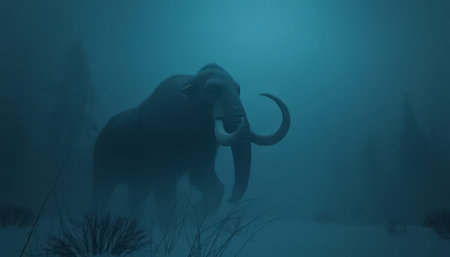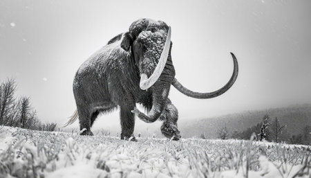 Digital artwork of an extinct woolly mammoth in a serene winter setting