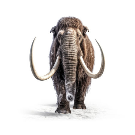 Highly detailed, realistic rendering of an extinct woolly mammoth on a white background.