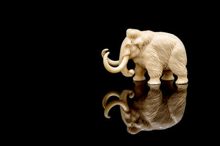 ivory statuette of elephant mammoth on black background with reflection. carved with a gouge from old bone. authentic decorative figure for interior.