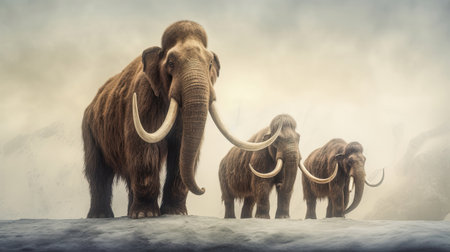 A herd of woolly mammoths walking through a snowy, misty landscape, evoking a prehistoric scene of strength, survival, and ancient wildlife.