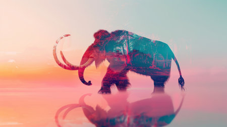 A digital illustration depicts a woolly mammoth silhouette against a misty sunrise backdrop, with an overlapping forest image blended into the mammoths form. The colors are warm and vibrant, and the overall effect is serene and awe-inspiring.