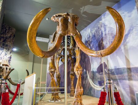 Azov, Russia - July 27, 2019: Fossil skeleton of the steppe mammoth. Exhibit of the Azov Historical Archeological and Paleontological Museum.