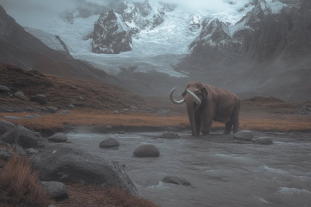 A woolly mammoth stands in a river, with snow-capped mountains and a misty atmosphere highlighting the end of the Ice Age.
