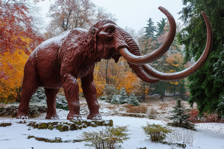 A majestic mammoth stands in a snowy environment surrounded by colorful autumn foliage, representing the end of the ice age.