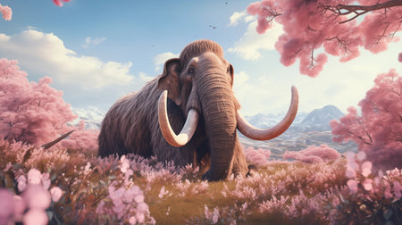 An AI generated illustration of a mammoth walking through a field of blossoms