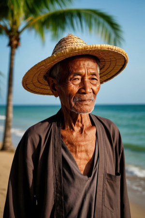 Portrait of a senior Vietnamese man wearing a straw hat and smiling