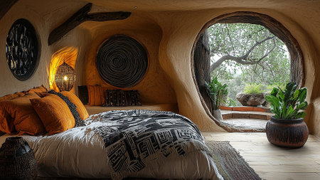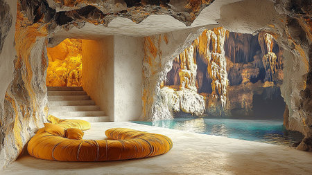 unique, cozy living space within a cave-like setting, blending natural stone walls with modern furniture