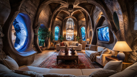 Modern living room inside underground home. Apartment interior in cave with stone walls. Unique architectural design in nature