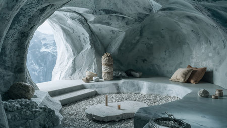 A cave interior features simple seating and decor. Natural light enters through the opening, revealing snow-covered mountains outside. The stones and soft cushions create a cozy feel.