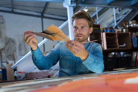 Young creative leatherworker applying black paint on edge of leather piece