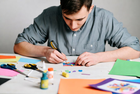 Young man in a blue shirt is engaged in the creation of a greeting card.