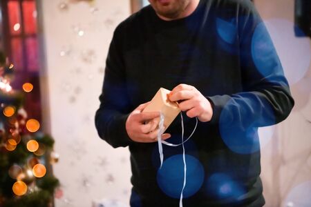 A young man carefully cuts twine for wrapping Christmas gifts in a warm, festive environment.