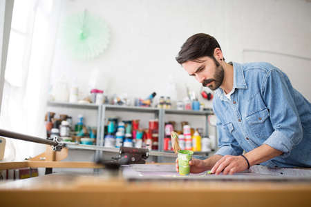Male printer applying green ink to silkscreen in printing press studio