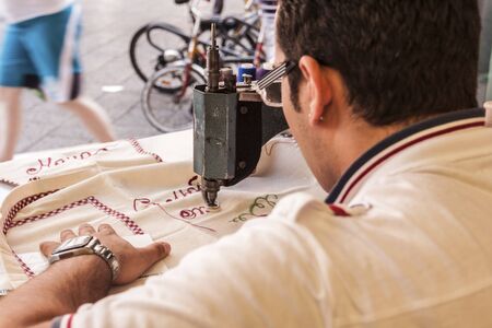 Person operating an industrial sewing machine with blue fabric