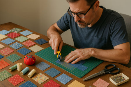 Tailor carefully cutting fabric squares and triangles on cutting mat, preparing them for sewing patchwork quilt