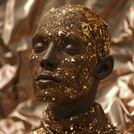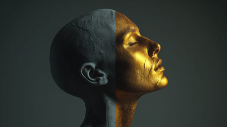 Face transitions from dull grey to vibrant gold with soft lighting that emphasizes the shift in appearance and mood without distractions.