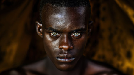Intense close-up portrait of a man featuring shimmering skin, set against a dark background, highlighting beauty and emotion through light and shadow.