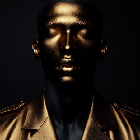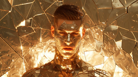 Futuristic Man with Metallic Face Paint in Golden Geometric Background