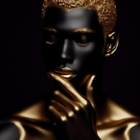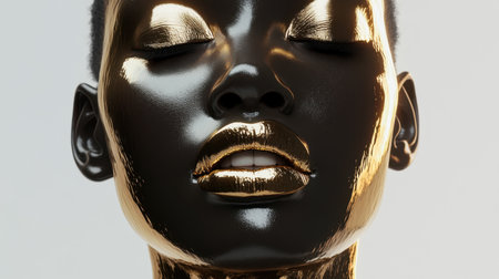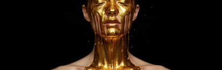 Golden liquid art on female face and neck on black background. That the image is generated using AI.