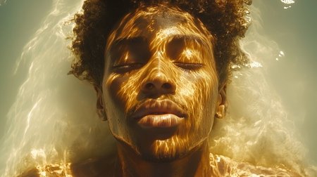 A serene close-up of a model face fully covered in a reflective golden liquid, symbolizing luxury and beauty.