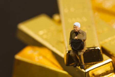 Gold, bullion or ingot in wealth management or investment asset allocation concept, miniature people manager businessman with suitcase sitting on stack of gold bar in dark security room.
