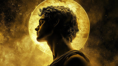 Golden statue of a thoughtful young man with a halo in front of a glowing celestial body on a starry night