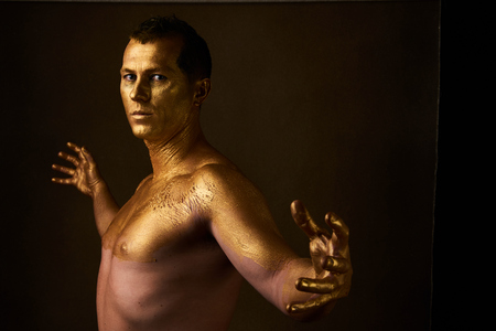Portrait of young attractive man with a gold makeup on her face and hands against a black background