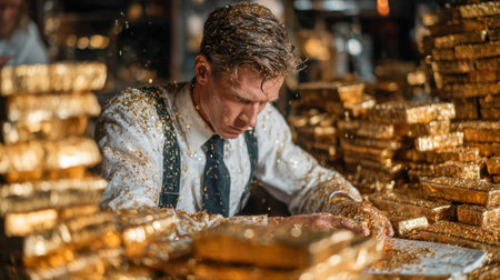 Focused businessman in white shirt and suspenders surrounded by shimmering gold bars, symbolizing wealth and success.
