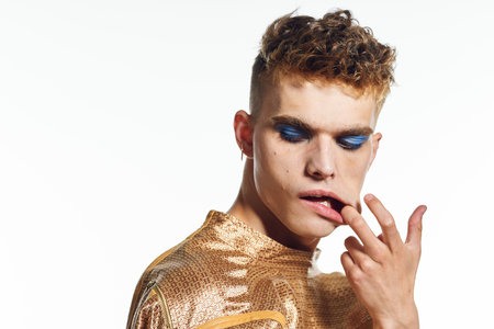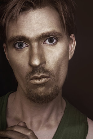 Studio portrait of young attractive blue-eyed men with gold makeup on her face and hands against black background