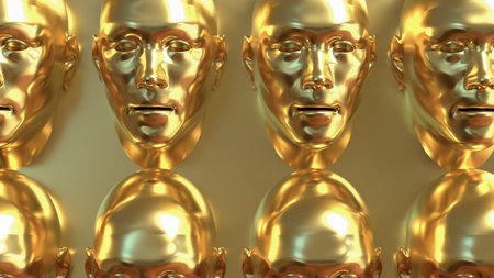 An AI generated illustration of 3 golden robots in a rain on golden particles