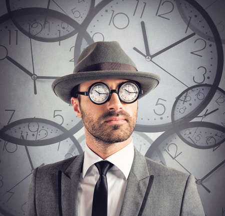 A young man shows fear amid floating clocks symbolizing time and pressure