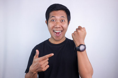 Excited asian man pointing his watch, looking at camera. isolated on white background
