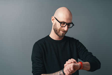 Smiling handsome bearded man with glasses looking at his smart watch while standing against a gray background