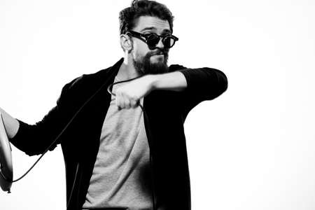 A man holds a guitar in his hands black leather jacket dark glasses music performance light background