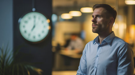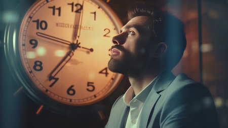 Time is money Thoughtful young man in formalwear looking at the wall clock : Generative AI