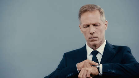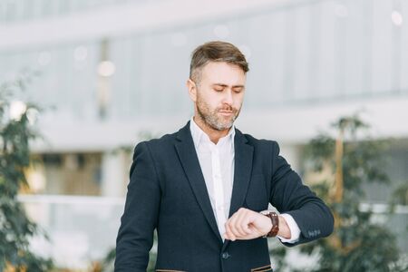 Business man looking at his watch, it's time to do. Bright office interior, for business meetings.