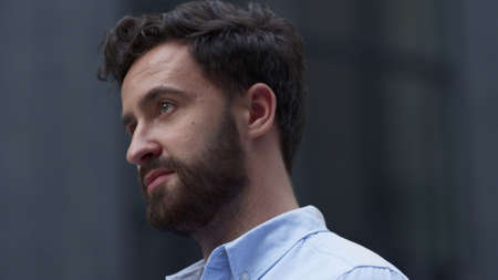 Portrait thoughtful businessman standing look in distance. Entrepreneur concept. Attractive bearded man startup ceo pose at office building. Ambitious professional manager director anticipate victory.