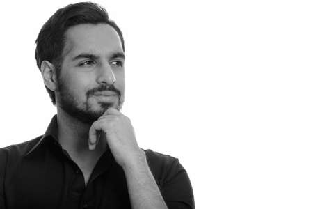 Studio shot of young handsome Indian man isolated against white background