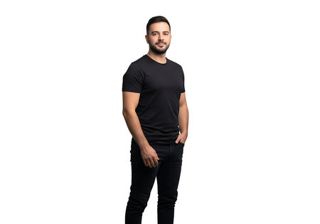 Portrait of a serious young man wearing a black t shirt, standing against a white background in a studio setting