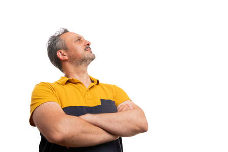 Adult man with arms crossed and curious expression looking up at blank copyspace for text advertising wearing summer attire yellow black tshirt isolated on white