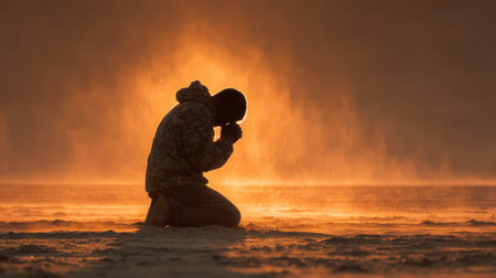 A silhouette captures a kneeling figure in prayer on a serene sand backdrop, bathed in warm golden sunlight, creating a tranquil and reflective atmosphere
