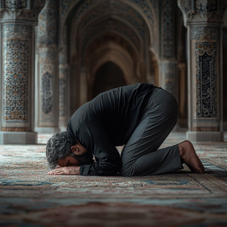 Muslim man praying inside mosque, kneeling on carpet, expressing devotion