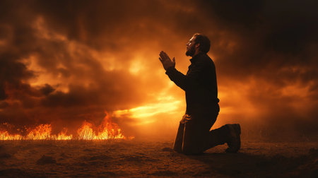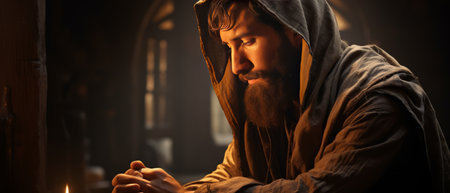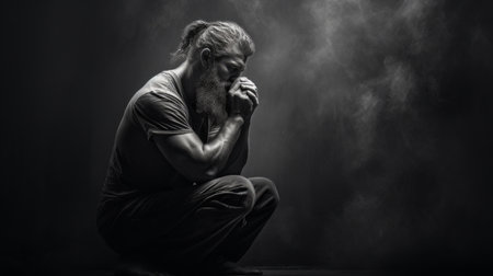 An AI generated illustration of A man is praying with his hands clasped to his face, standing in front of a dark background