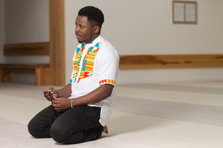 Black African Muslim Man Is Praying In The Mosque