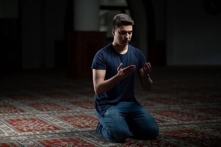 Young Muslim Man Making Traditional Prayer To God Allah
